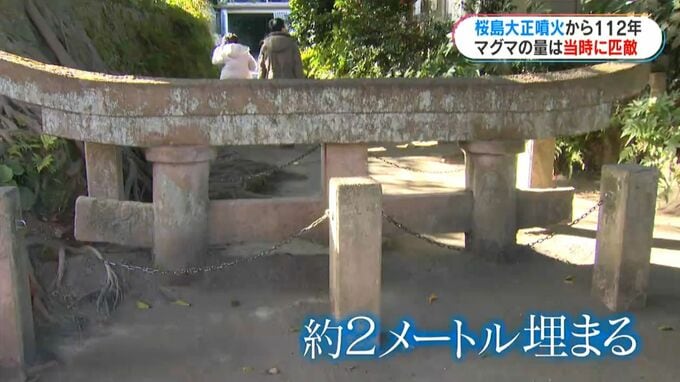 大正噴火と同じ規模の噴火が起きた場合、鹿児島市の市街地側では最大1メートルほどの降灰が予想されています。大正噴火では火口から1.5キロほど離れた黒神町の集落に大量の灰が降り、3メートルの高さがあった鳥居は2メートルほど埋まりました。