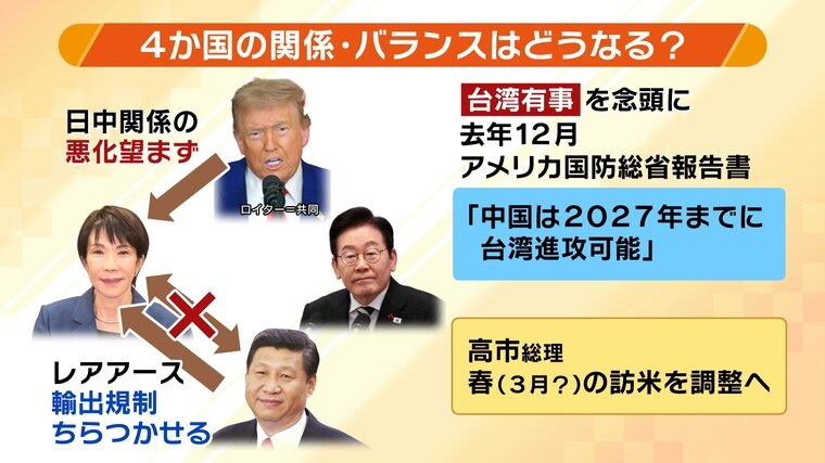 高市総理の台湾有事をめぐる発言で日中関係は悪化し、中国側がレアアース輸出規制をちらつかせている状況です。一方、アメリカは日中関係の悪化を望んでいませんが、台湾有事を念頭に去年12月、「中国は2027年までに台湾進攻可能」との報告書が出ています(アメリカ国防総省報告書)。
