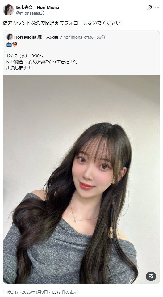 俳優・タレントの堀未央奈さんが自身のXで、偽アカウントの出現について注意喚起しています。