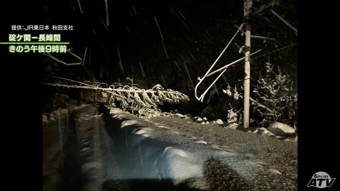 JR奥羽本線、平川市の碇ケ関駅と大鰐町の長峰駅間です。倒木が電線にもたれかかり、雪が線路を埋めつくしています。