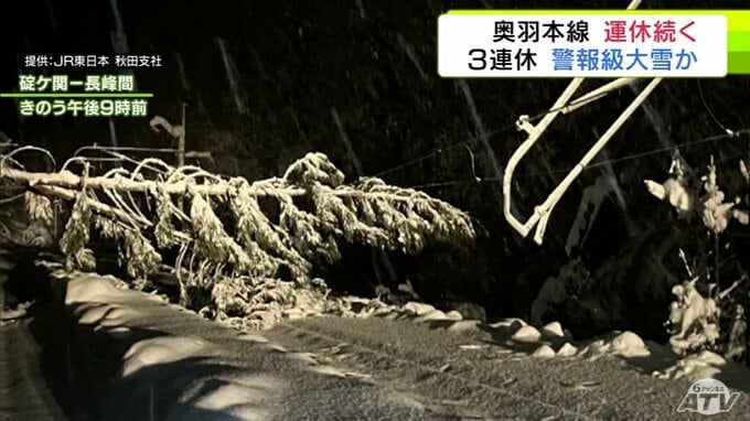 奥羽本線は、大雪にともなう数十本の倒木と設備被害が確認されていて、7日夜から一部区間の運転見合わせが続いています。