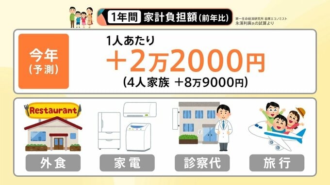 第一生命経済研究所・主席エコノミストの永濱利廣さんの試算によると、2026年1年間の家計負担額は、前年比で、▼1人あたり2万2000円、▼4人家族だと8万9000円ほど増えるのではないかとされています