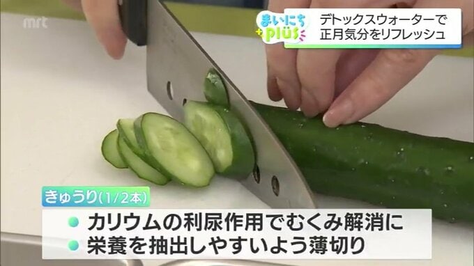 2. きゅうりは栄養を抽出しやすいよう、薄切りにします。きゅうりに含まれるカリウムの利尿作用で、むくみ解消が期待できます。