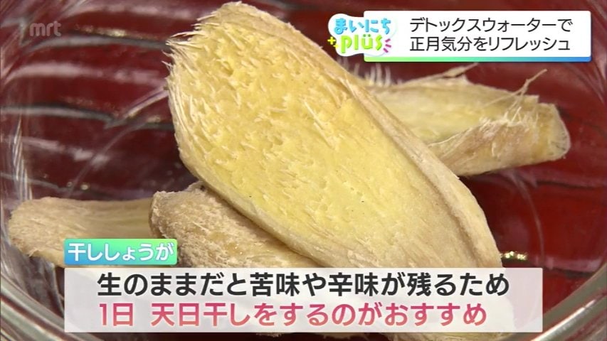 2. 干ししょうがを加えます。生のままだと苦味や辛味が強いため、1日天日干ししたものを使うのが、飲みやすく仕上げるコツです。