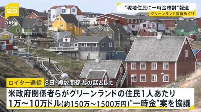 ロイター通信は8日、アメリカ政府関係者らが、グリーンランドの住民1人あたり、1万ドル~10万ドル、日本円で約150万円~1500万円の一時金を支払う案について協議したと伝えました。