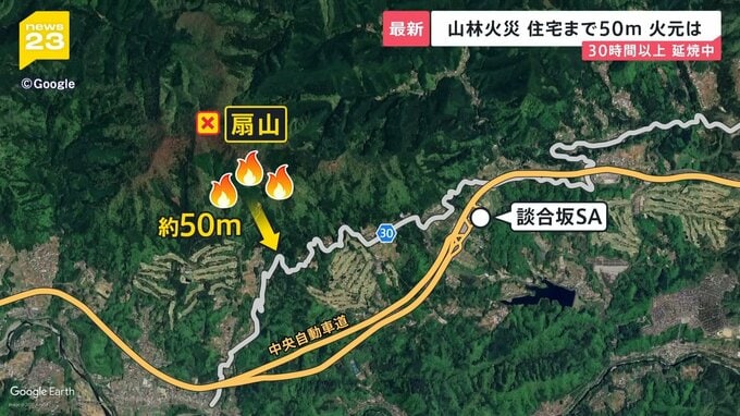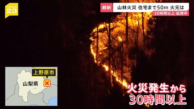 暗闇を赤く染める炎。山梨県上野原市で発生した山林火災は、30時間以上燃え続けています。