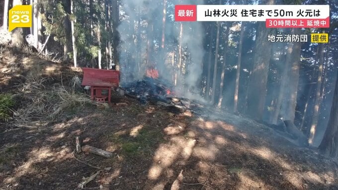 発生直後、山頂付近で地元の消防団が撮影した写真からは、積み上げられた木材でしょうか、燃えているのがわかります。