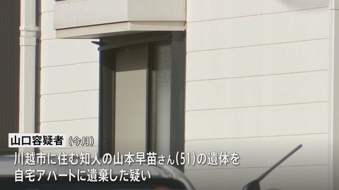 埼玉県新座市のアパートの一室に知人女性の遺体を遺棄したとして、住人の53歳の男が逮捕されました。新座市の職業不詳・山口新容疑者(53)は今月、川越市に住む知人の山本早苗さん(51)の遺体を自宅アパートに遺…