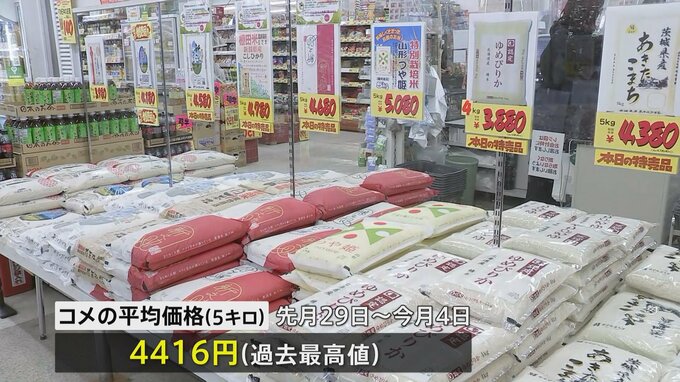 今年初めてとなるスーパーでのコメの平均価格は5キロあたり4416円となり、過去最高値を更新しました。農林水産省によりますと、先月29日から今月4日までに全国のスーパーで販売されたコメ5キロ当たりの平均価格は44…