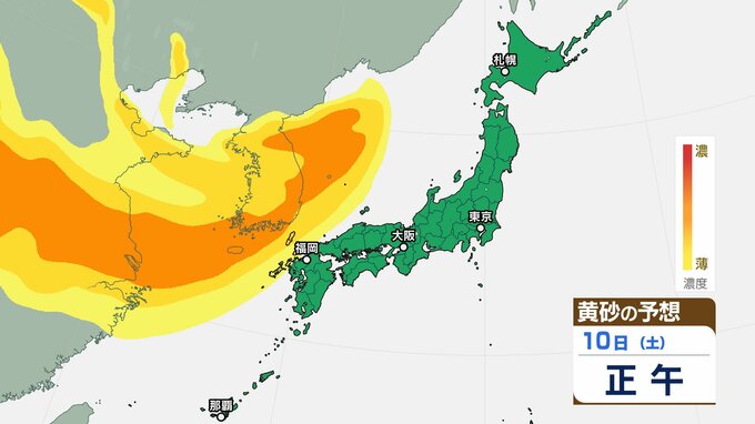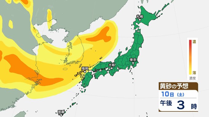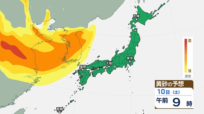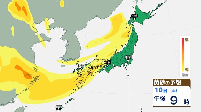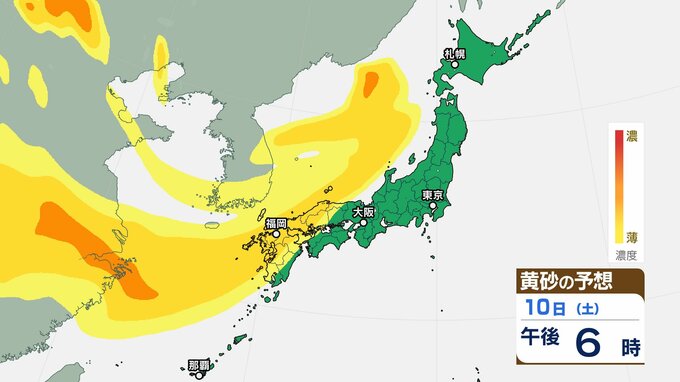 【黄砂情報】日本列島の広範囲にわたり飛来か 中国・四国地方はあすにかけて注意 13日(火)にもは九州地方などに飛来の見込み 屋外の洗濯物やアレルギー対策などに注意 黄砂シミュレーション【気象庁 10日午後1時更新】 RSK山陽放送 2026年1月10日(土) 13:00 国内 10日(土)の黄砂はどうなる? 10日(土)の黄砂のシミュレーションは、【画像②~】のとおりです。九州、四国、中国、北陸、東北、北海道に黄砂の飛来が予想されています。 【画像②】 【画像③】 【画像④】 【画像⑤】 【画像⑥】