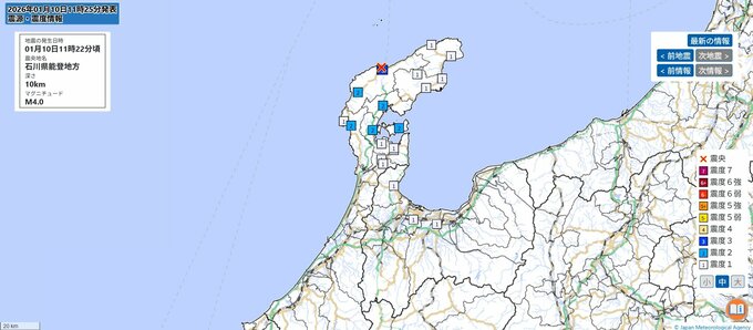 震源地は、石川県能登地方で、震源の深さは約10km、地震の規模を示すマグニチュードは4.0と推定されます。