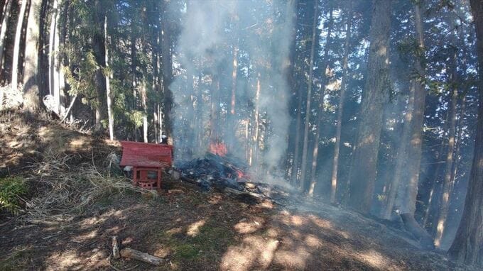 【LIVE画像あり】山林火災延焼続く 火は最も近い住宅まで約50メートル ヘリコプターなどで消火活動再開 山梨・上野原市 テレビ山梨 2026年1月10日(土) 13:00 国内 山林火災の発生直後に地元の消防団員が撮影した写真 消防によりますと、今回の火災は扇山登山道の中腹にある休憩スペースとなっているほこらの周辺が火元になリ、周囲に燃え広がったとみられるということです。 なお、これまでにけが人や建物への延焼は確認されていません。