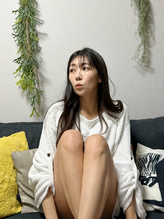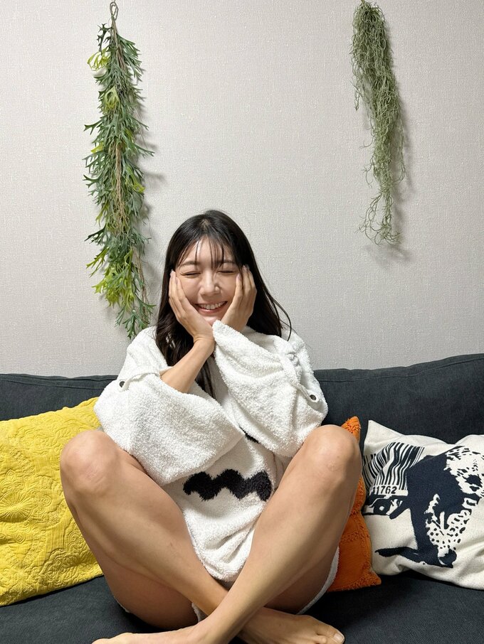 週末を迎え穂川さんは、白いふわふわ素材のルームウェアを着用し、ソファの上で膝を抱えてくつろぐ写真を投稿。