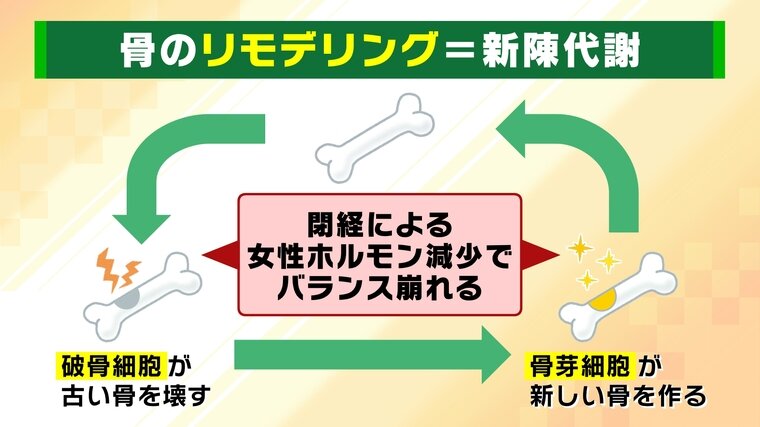 「破骨細胞」が古い骨を壊し「骨芽細胞」が新しい骨を作る…この骨のリモデリング=新陳代謝が、閉経による女性ホルモン減少で上手く機能しなくなるそうです。