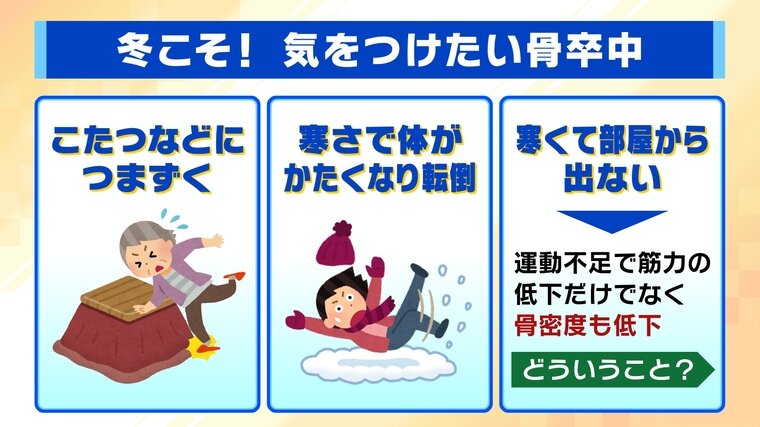 こたつなどにつまずく、寒さで体がかたくなり転倒…など骨卒中のリスクが高まるのが冬場です。