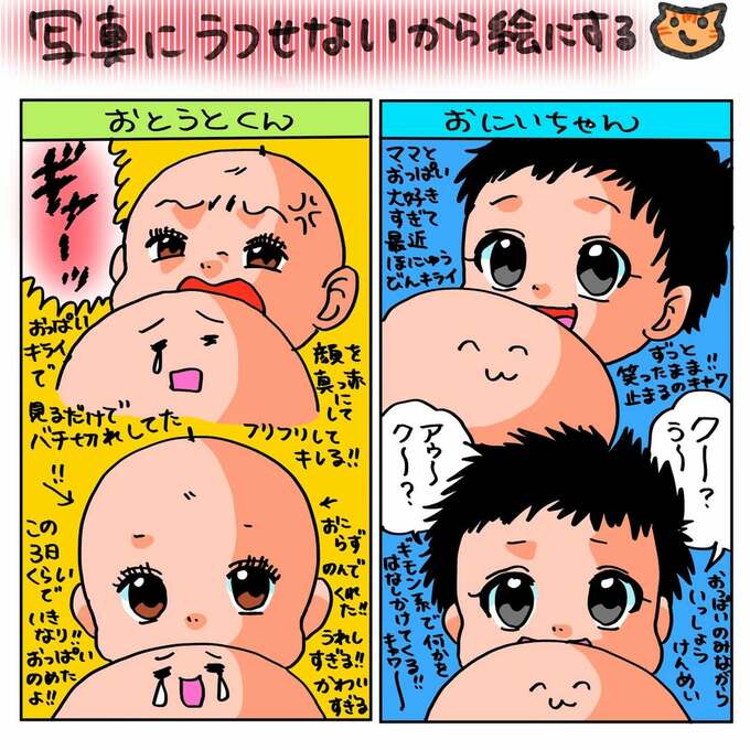 翔子さんは「写真にうつせないから絵にする」と題して、絵日記で「おとうとくん」「おにいちゃん」への授乳事情を描いています。弟くんは「おっぱいキライで見るだけでバチ切れしてた」と、ちょっとビックリするような反応。これまではほ乳瓶からの授乳だったようですが、この絵日記では「この3日くらいでいきなり!!おっぱいのめたよ!!」と、直接の授乳が出来たようで、翔子さんは「うれしすぎる!!かわいすぎる」と感動している様子です。