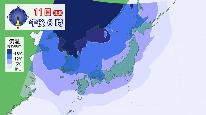 上空1500m付近の寒気の予想を見てみると、11日夕方、平地で雪を降らせる目安の-6℃以下の寒気が日本の南岸まで覆っています。広島では、さらに強いレベルの-12℃以下の寒気が県内にかかっています。また、上空のより高い位置の寒気を見ると、北日本を中心に、西日本の日本海側でも大雪を降らせる目安の非常に強い寒気が入る見通しです。雪雲が活発化する時間がある見込みです。