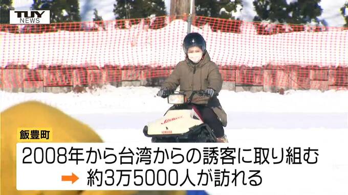 歓声をあげるのは台湾からの観光客です。飯豊町のどんでん平ゆり園は1月からは雪遊びが楽しめるスノーパークに姿を変えます。飯豊町では2008年から台湾からの誘客に取り組み、これまでおよそ3万5000人が訪れていますが、今年は予約だけで1万3000人近くが訪れる見込みです。