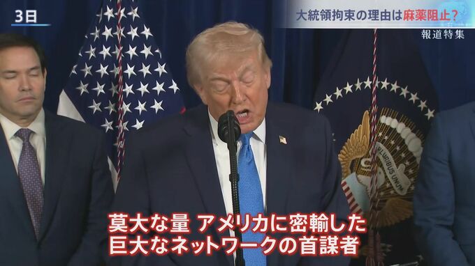 ベネズエラへの軍事攻撃と大統領拘束の理由について、トランプ大統領はアメリカへの麻薬流入を阻止するためだと述べた。