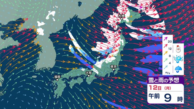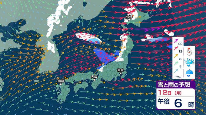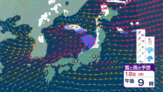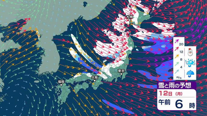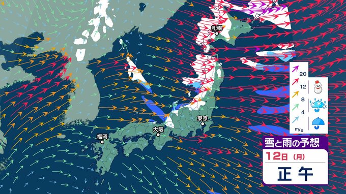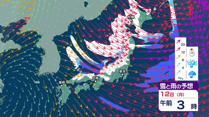 【大雪情報】強い冬型の気圧配置→12日(月)にかけて北日本から西日本で大荒れの天気「暴風・猛吹雪・高波に警戒」 東北80㎝、北陸・東海70㎝の降雪予想 交通障害のおそれも【気象庁 雪風シミュレーション/11日午後7時更新】 RSK山陽放送 2026年1月11日(日) 09:18 国内 天気 12日(月)3時間ごと「雪と風」のシミュレーション