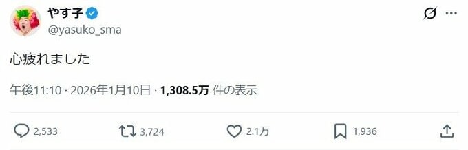 10日、やす子さんは「心疲れました」と、短く投稿。