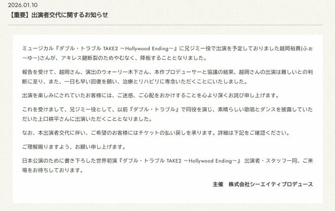ミュージカル『ダブル・トラブル TAKE2 ~Hollywood Ending~』の公式サイトは、兄ジミー役で出演を予定していた越岡裕貴(ふぉ~ゆ~)さんが、アキレス腱断裂のためやむなく降板することを発表しました。