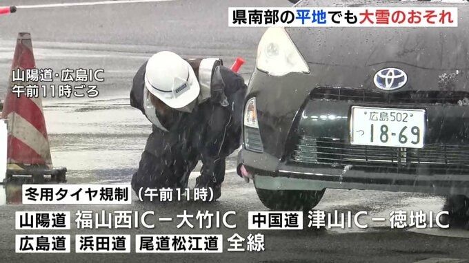午前11時現在、山陽道は、福山西ICから大竹IC。中国道は、津山ICから徳地ICなどで、冬用タイヤ規制が実施されています。