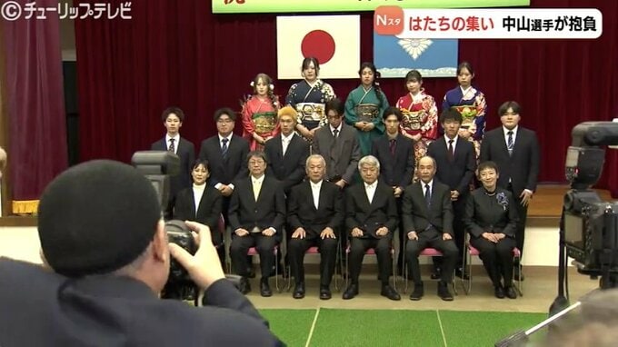 このうち中山選手が出席した富山市山田地域では色鮮やかな振袖やスーツ姿の14人が参加。