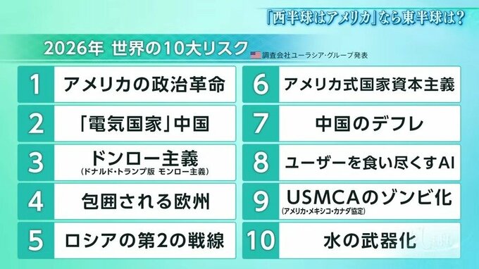 1位は、トランプ氏によって政治が根底から覆る懸念を示す「アメリカの政治革命」。4つがトランプ氏がらみで、3位には「西半球」での覇権を唱える「ドンロー主義」が入りました。