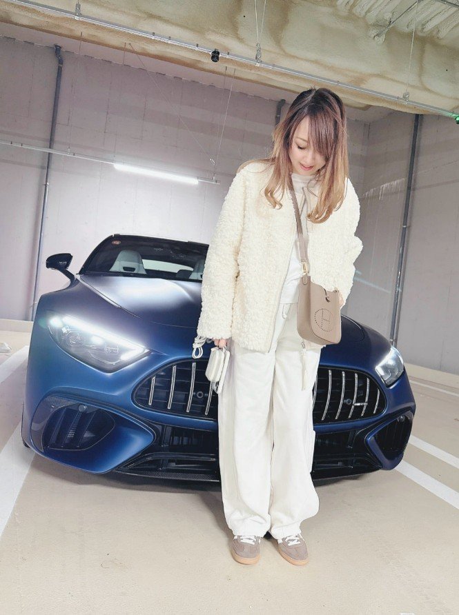 投稿された画像では、「メルセデス・ベンツ SLクラス」をバックに佇む、渡辺美奈代さんの姿が見て取れます。