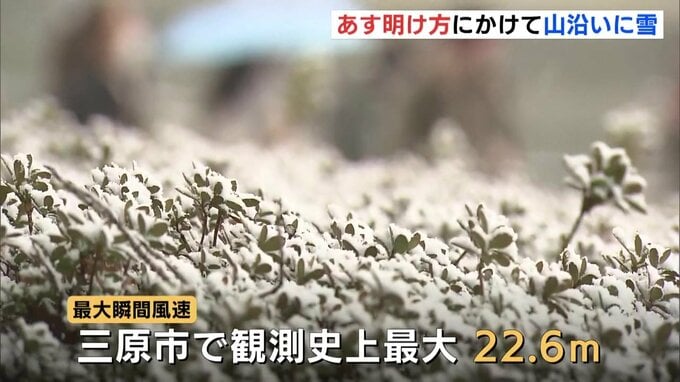 一方、三原市では、1月の観測史上で最大の瞬間風速を記録するなど、各地で風が強く吹きつけました。12日の明け方にかけては、山沿いを中心に雪が断続的に強まる見通しです。路面の凍結などに十分注意してください。