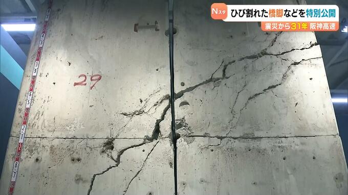 阪神・淡路大震災から31年になるのを前に、阪神高速道路は震災で被害を受けた橋脚などを保管する保管庫を特別公開しました。 コンクリート製の橋脚が大きくひび割れています。神戸市東灘区にある阪神高速の「震…