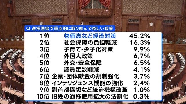 次の通常国会で高市総理に重点的に取り組んで欲しい政策を聞いたところ、1位は「物価高など経済対策」、2位は「社会保障の負担軽減」、3位は「子育て・少子化対策」でした。