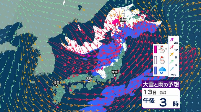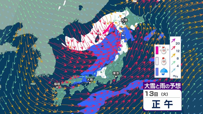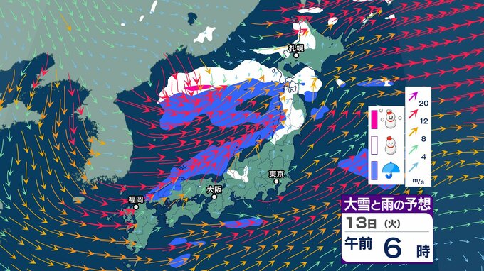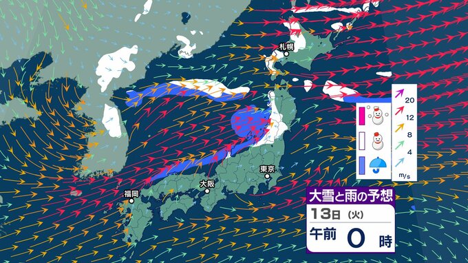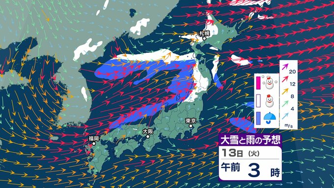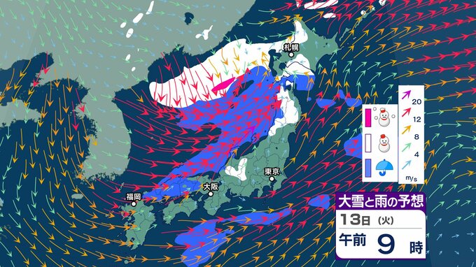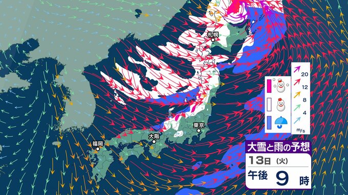 【大雪情報】ピークは過ぎつつあるものの、北日本・東日本で12日は暴風雪や高波続く 視界が効かなくなる「猛ふぶき」のおそれ 大雪による交通障害にも注意【気象庁 雪風シミュレーション/12日午前9時更新】 RSK山陽放送 2026年1月12日(月) 09:25 国内 天気 13日(火)3時間ごとの雪風シミュレーション