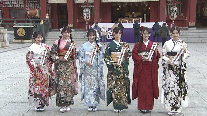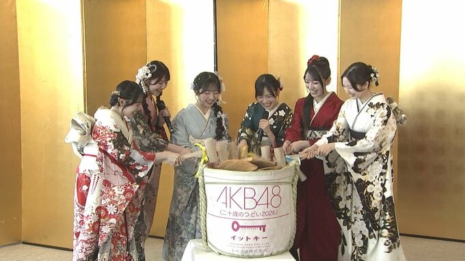 アイドルグループAKB48が東京・神田明神で毎年恒例「AKB48 二十歳のつどい 2026」を行い、秋山由奈さん、新井彩永さん、工藤華純さん、久保姫菜乃さん、迫由芽実さん、花田藍衣さんの6人が艶やかな振袖姿を披露しました。