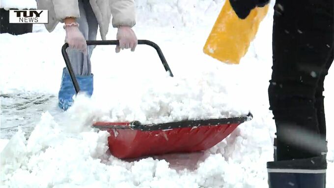 連休最終日にまとまった雪となり、住宅街では子どもたちが雪遊びをする中、親は雪かきに精を出していました。