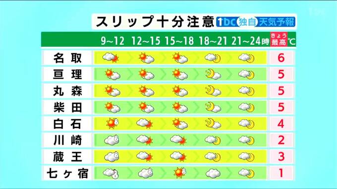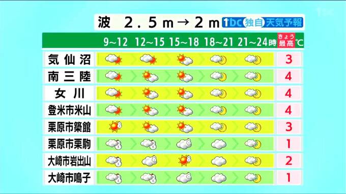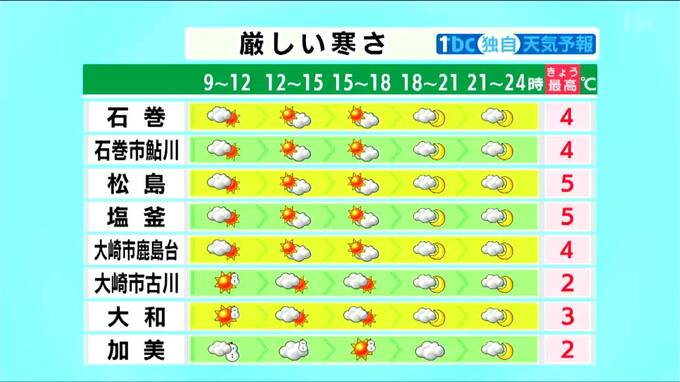 沿岸の地域を中心に日差しが届きますが、寒気の影響で気温は上がりません。最も高い名取でも6℃程度にとどまる見込みです。スリップに十分お気をつけください。