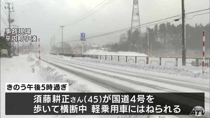 11日夕方、青森県平内町の国道で横断していた男性が車にはねられ、意識不明の重体です。11日午後5時過ぎ、平内町小湊の国道4号で近くに住む須藤耕正さん(45)が道路を歩いて渡っていたところ、軽乗用車にはねられま…
