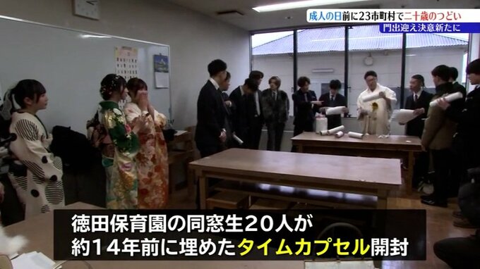 矢巾町の二十歳のつどいでは、式典後に徳田保育園の同窓生20人が集まって、およそ14年前に埋めたタイムカプセルを開封しました。