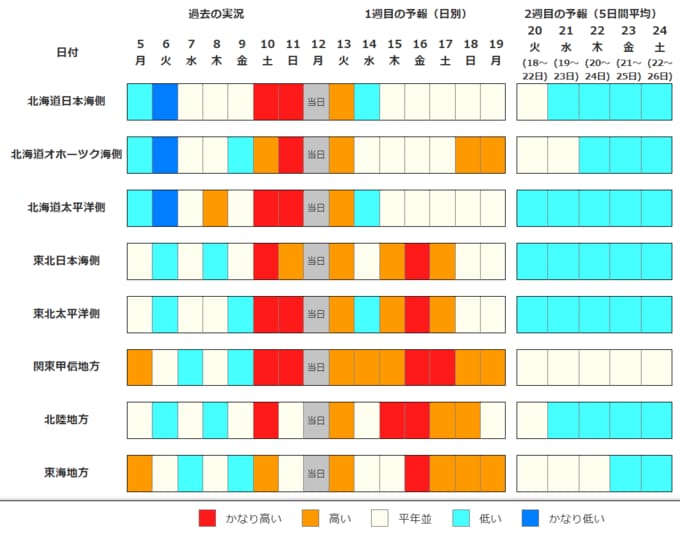 北日本の気温は、向こう7日間程度は平年並か高い日が多いですが、その後は低い日が多いでしょう。