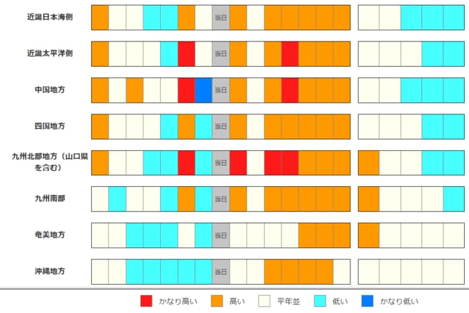 沖縄・奄美の向こう2週間の気温は、平年並か高いでしょう。