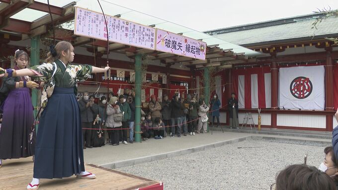 二十歳の若者が弓を射て邪気を払う新年の恒例行事「弓始式」が12日、山口県防府市の防府天満宮でありました。