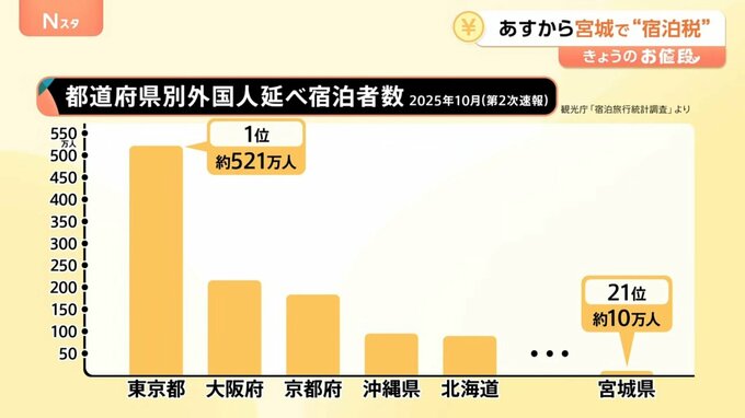 2025年10月の外国人宿泊者数は、1位東京都の約521万人に対し、宮城県はその50分の1で21位と全国上位から大きく離されています。