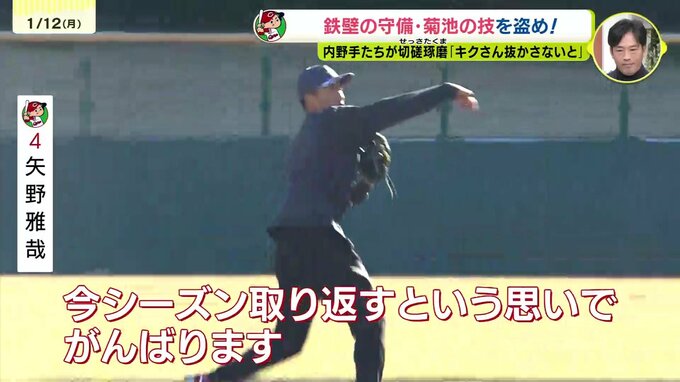 5年連続、師匠・菊池選手の自主トレに参加している矢野選手は自身に足りない守備の安定感を追求します。矢野は「レギュラーを1回掴みかけたところをまた手放してしまったので、昨年の悔しさを常に持ちながら、今シーズン絶対取り返すっていう思いで頑張っています」と今季の奮起を誓いました。