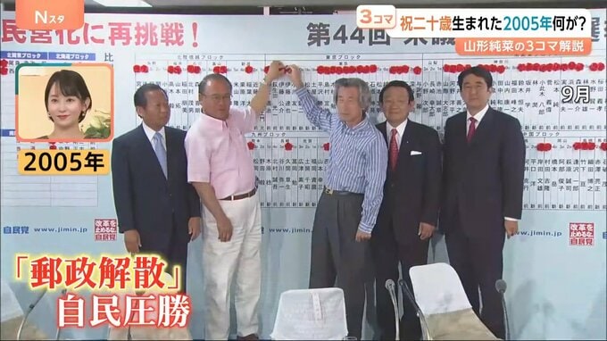 20年前といえば、当時の小泉純一郎総理が「郵政民営化の是非を問う」として衆議院を解散。いわゆる“郵政解散”で自民党が大勝利を収めた年。