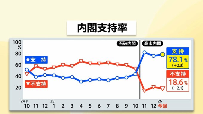 この土日にJNNが行った世論調査では、高市内閣を「支持できる」という人は12月の調査より2.3ポイント上昇し78.1%でした。