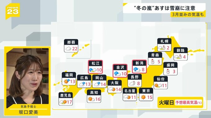 「全国的に3月並みのところが多くなりそうです。日本海側でも雪ではなく、雨の範囲が広くなりそうです。性質が違うものが降ると雪崩が起きやすくなりますので、注意が必要です」
