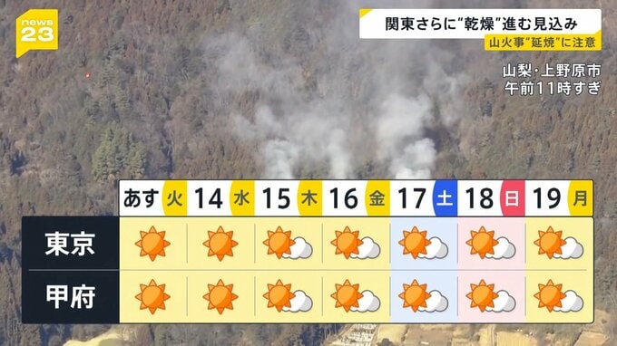 逆に、関東地方はしばらく晴れが続く見込みです。山梨県上野原市では山林火災の延焼が続いていますが、今後、空気の乾燥は一層進むとみられます。