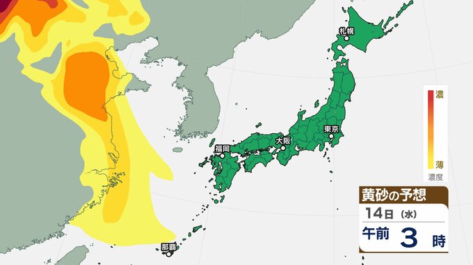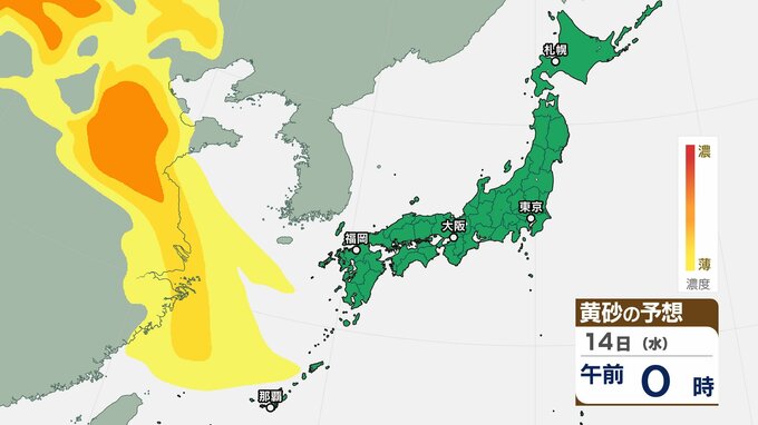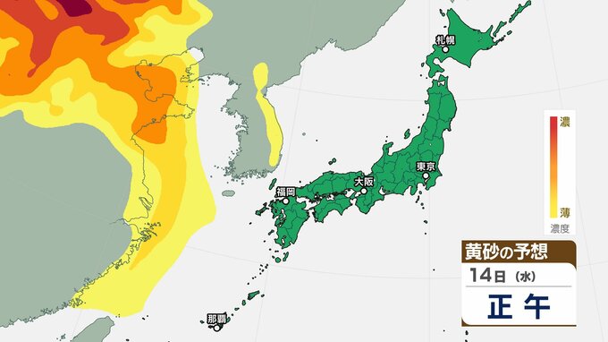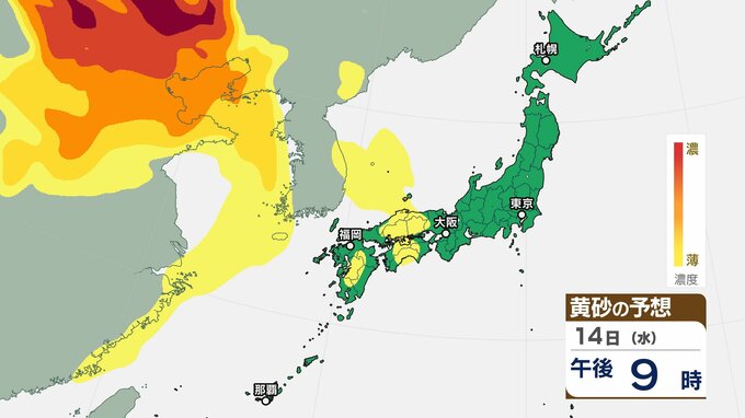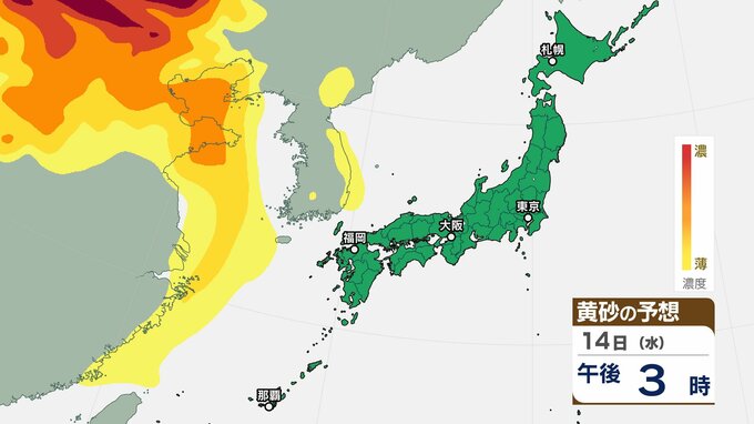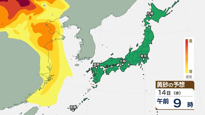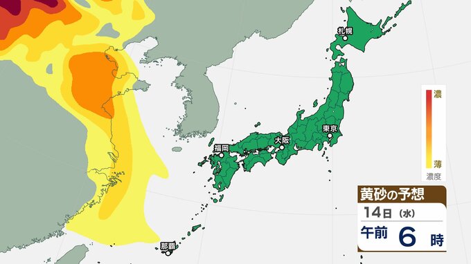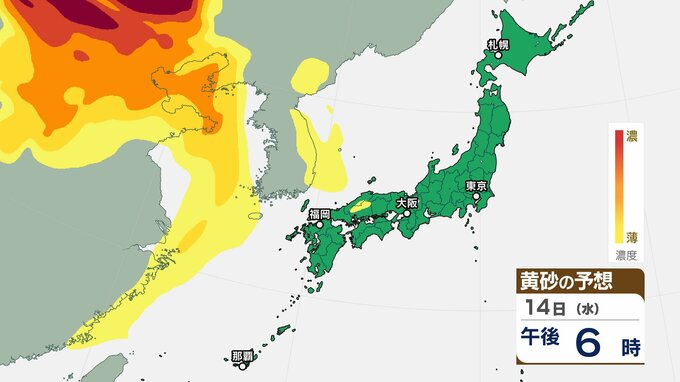 【黄砂情報】 13日(火)から日本列島に飛来の見込み 15日(木)・16日(金)は広い範囲で影響か 屋外の洗濯物やアレルギー対策などに注意 黄砂シミュレーション【気象庁 13日午前9時更新】 RSK山陽放送 2026年1月13日(火) 08:40 国内 天気 14日(水)の黄砂はどうなる? 14日(水)は【画像⑧~】の通りです。黄砂は中国地方、四国地方、九州地方の一部地域に飛来する見込みです。 【画像⑧】 【画像⑨】 【画像⑩】 【画像⑪】 【画像⑫】 【画像⑬】 【画像⑭】 【画像⑮】