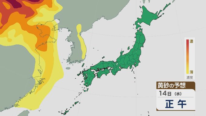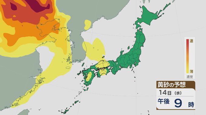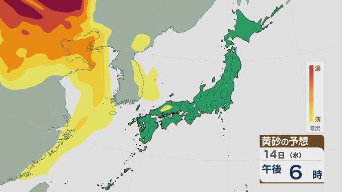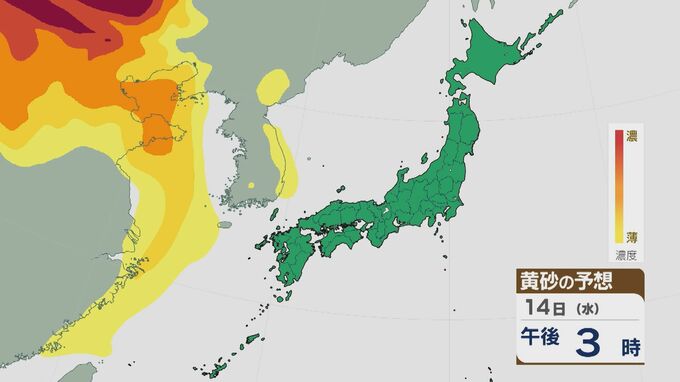 【黄砂情報】大陸からの黄砂が14日(水)以降西日本を中心に飛来 16日(金)は九州から東北南部の広範囲に 乾燥する太平洋側では特に注意を 最新の飛来予想シミュレーション 北陸放送 2026年1月13日(火) 09:28 国内 14日(水)以降15日(木)にかけて、西日本を中心に黄砂が飛来する見込みです。16日(金)には、九州から東北南部にかけて広い範囲で飛んできそうです。 黄砂の予想ですが、14日の午後から中国地方や四国に飛来するでしょう。